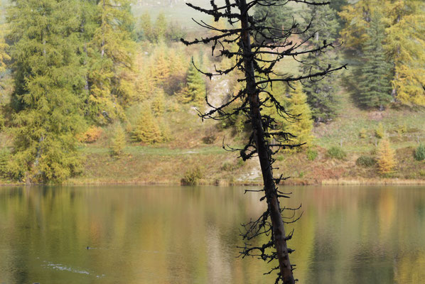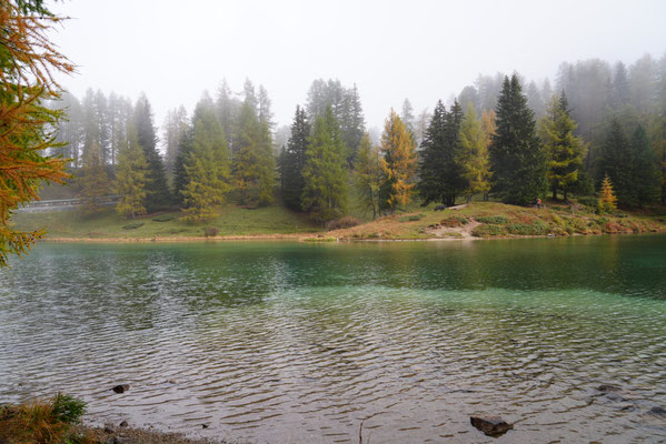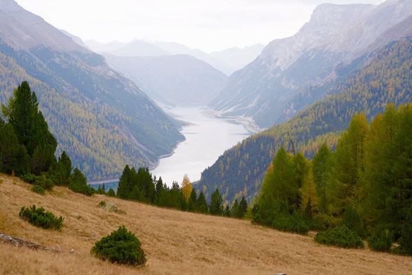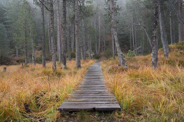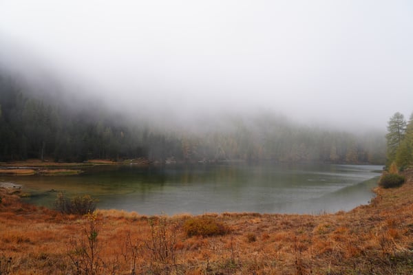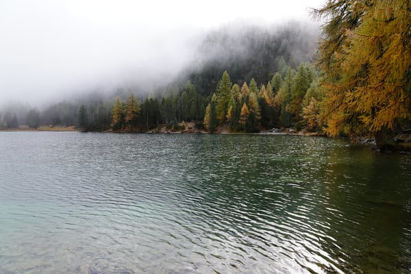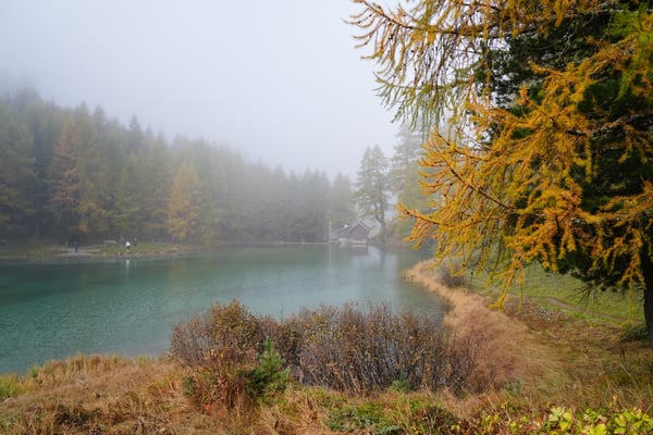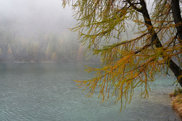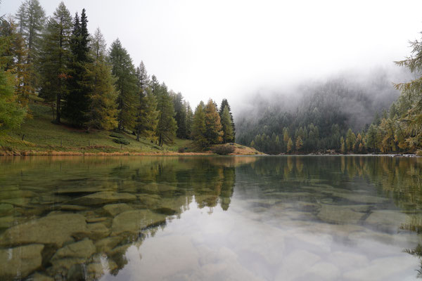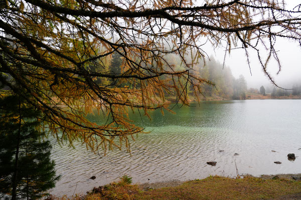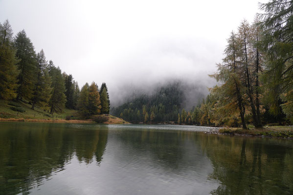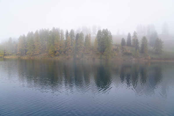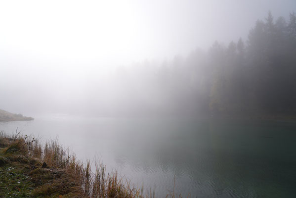 Auf dem Nachhauseweg zurück ins Unterland queren wir den Parc Ela. Wir kommen in dichtem Nebel über den Albulapass und machen Halt am Lai da Palpuogna. Die Stimmung am See ist absolut mystisch! Die Sonnenstrahlen finden nur vereinzelt den Weg durch den Nebel. Wunderschön.