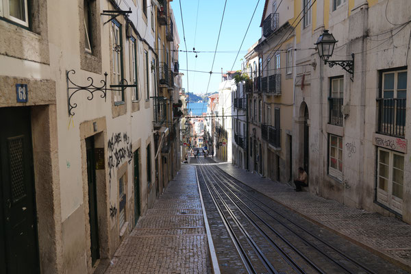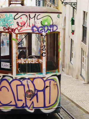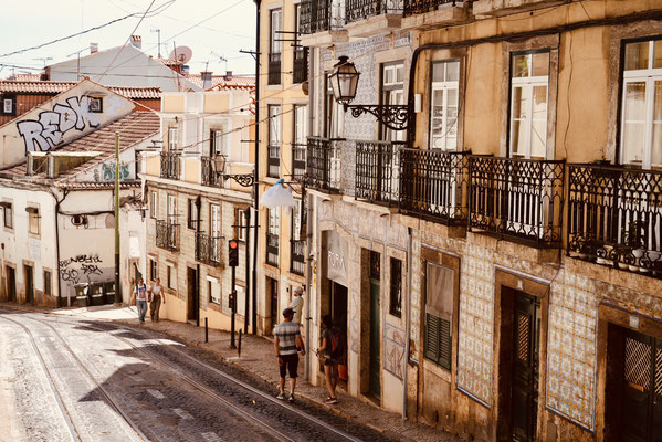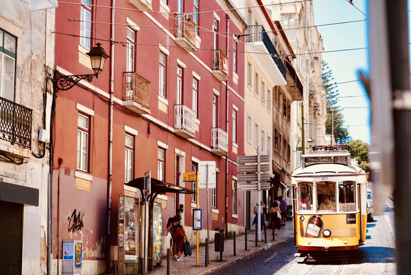 Ach und mit der Strassenbahn durch Lissabon fahren ist ganz wunderbar! Es ist ein normales Verkehrsmittel für die Lissabonner, aber auch eine der besten Arten, durch die historischen Stadtviertel zu fahren. Die Strassenbahn macht sich gut auf jedem Foto, und das Geräusch, wenn die sie in den Schienen fährt, ist eins der charakteristischsten der Stadt. Die Linie 28 – Elétrico 28 – ist die bekannteste. Nostalgisch tuckert die senfgelbe Strassenbahn also die Hügel auf und ab durch die engen und steilen Gassen der historischen Altstadt Alfama und verbindet dabei den Martim-Moniz-Platz im Nordosten Lissabons mit dem Stadtteil Prazeres im Südwesten. Während der 40-minütigen Fahrt staunen wir nicht nur über die historischen Bauwerke und die einzigartige Lissaboner Streetart, sondern auch über das Talent des Fahrers, durch die schmalsten, einspurigen Gassen vorbei an parkenden Mofas und lebendigen portugiesischen Familienrunden am Mittagstisch zu lenken. Diese Fahrten sind absolut entschleunigend!